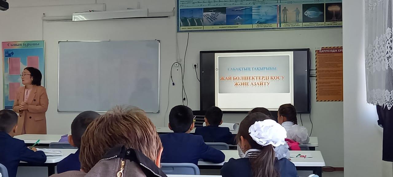 11 қараша күні математика пәні мұғалімі Несипбаева Жансая 5 сынып оқушыларымен "Жай бөлшектерді қосып, азайту" тақырыбында ашық сабақ өткізді.