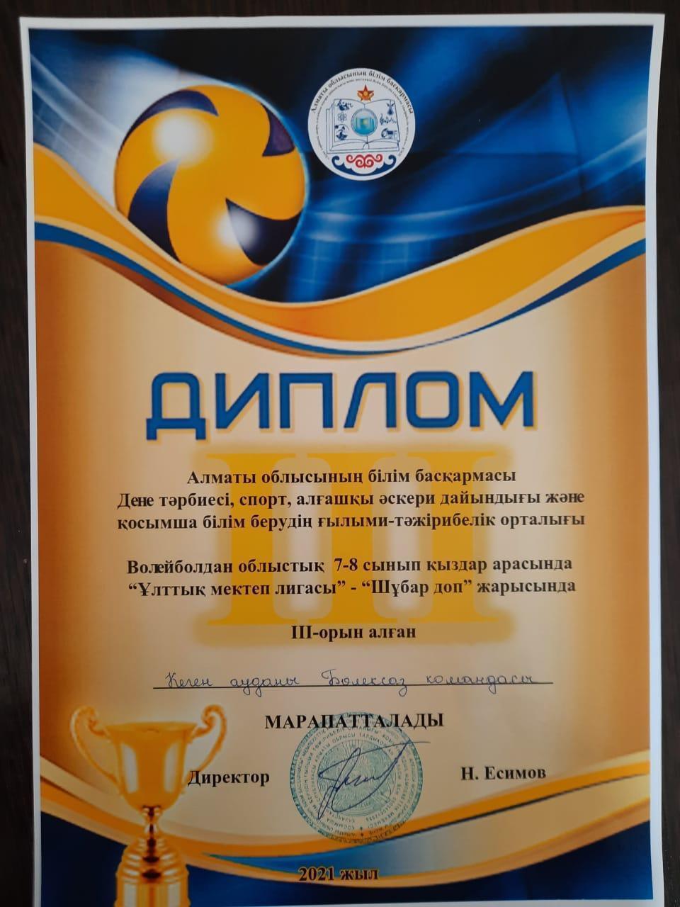 Алматы облысы білім басқармасы Дене тәрбиесі, спорт, алғашқы әскери дайындығы және қосымша білім берудің ғылыми-тәжірибелік орталығы ұйымдастырған волейболдан "Ұлттық мектеп лигасы"- "Шұбар доп" жарысында Кеген ауданы Бөлексаз орта мектебі қыздар командасы 3-орын алды.