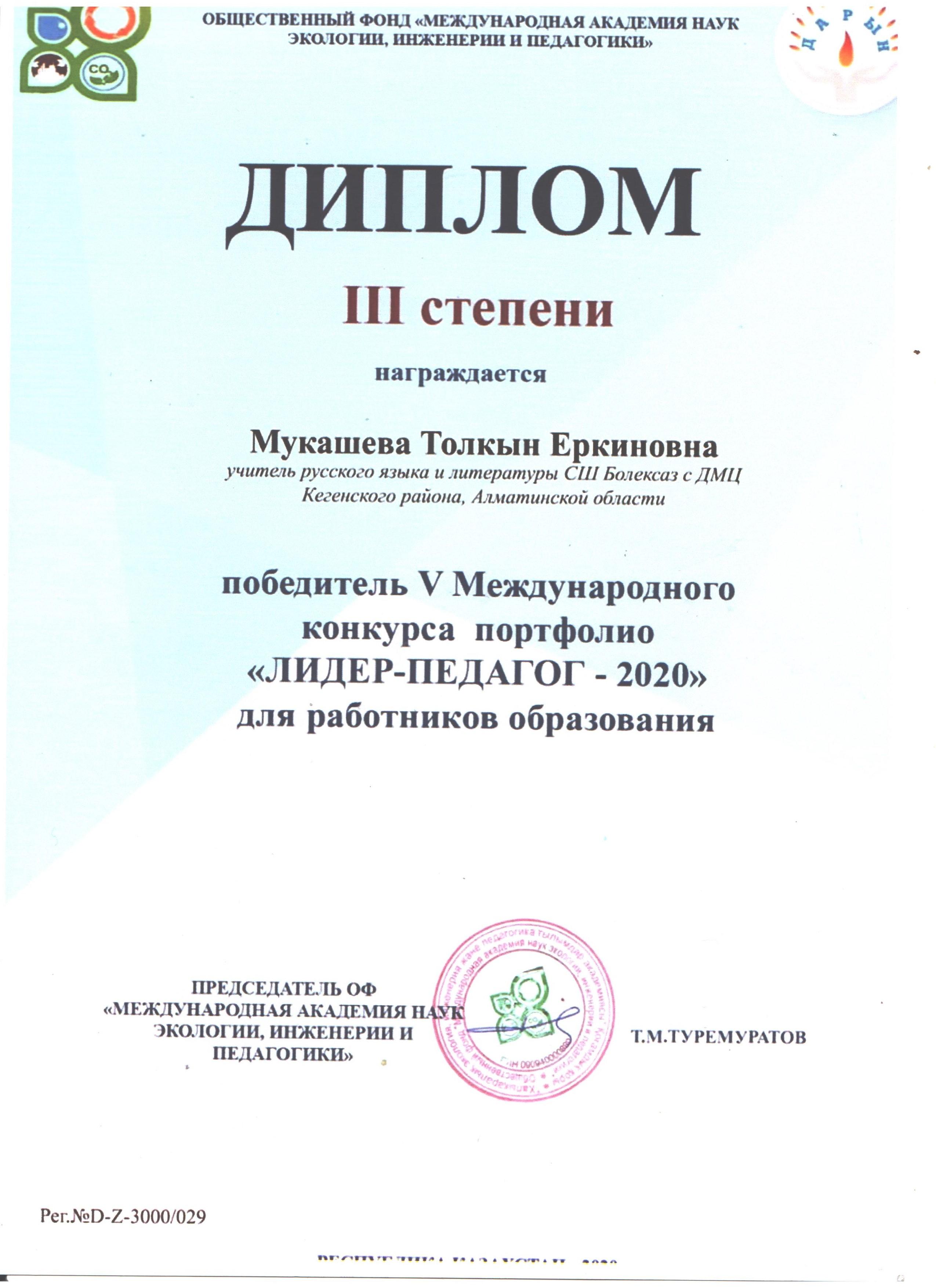 20 ноябрь 2020 0 1 2 3 4 5 Мұғалім жетістігі Ү Халықаралық "Лидер-педагог-2020" білім саласы қызметкерлерінің портфолио конкурсынан орыс тілі пәнінің мұғалімі Мукашева Толқын ІІІ дәрежелі дипломмен марапатталды
