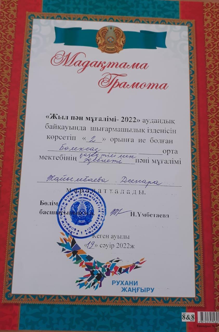 19 апрель 2022 0 1 2 3 4 5 мұғалім жетістігі "Жыл пән мұғалімі-2022" аудандық байқауында 2-орын алған Жаймбаева Динара марапатталды