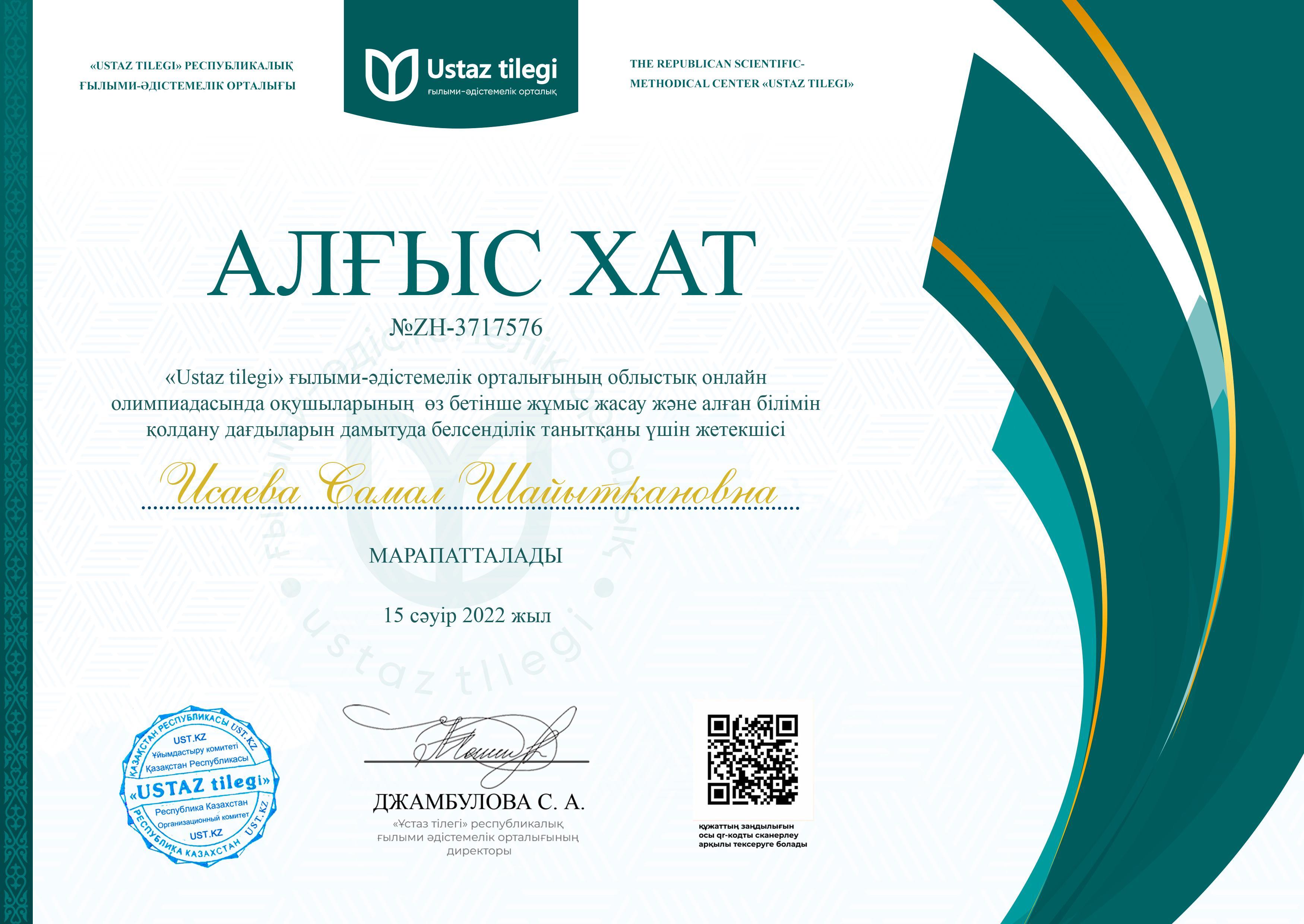"Ustaz tilegi" ғылыми- әдістемелік Облыстық онлайн олимпиядасында оқушылардың өз бетінше жұмыс жасау және алған білімін қолдану дағдыларын дамытуға белсенділік танытқаны үшін жетекшісі Исаева Самал Шайыткановна марапатталады
