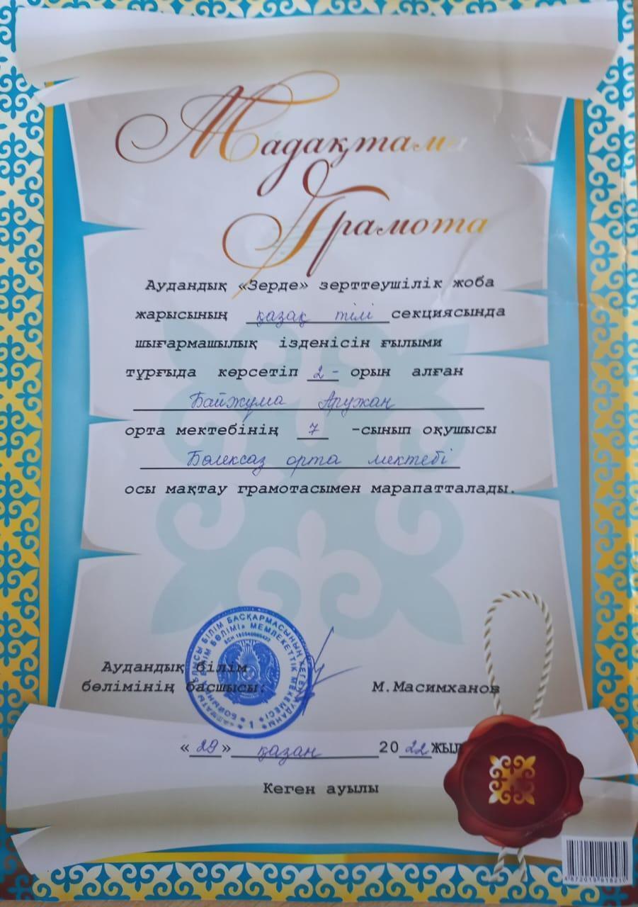 29 октябрь 2022 0 1 2 3 4 5 Оқушы жетістігі Аудандық "Зерде" зерттеушілік жоба жарысының қазақ тілі секциясында шығармашылық ізденісін ғылыми тұрғыда көрсетіп 2-орын алған Байжұма Аружан марапатталды. Жетекшісі Салпанбаева Ақерке