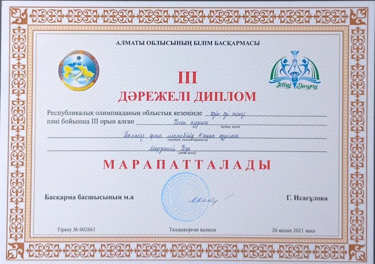 26 февраль 2021 0 1 2 3 4 5 оқушы жетістігі Республикалық олимпиаданың облыстық кезеңінде өзін-өзі тану пәні бойынша 3-орын алған Мырзатай Роза марапатталды. Жетекшісі Салпанбаева Ақерке