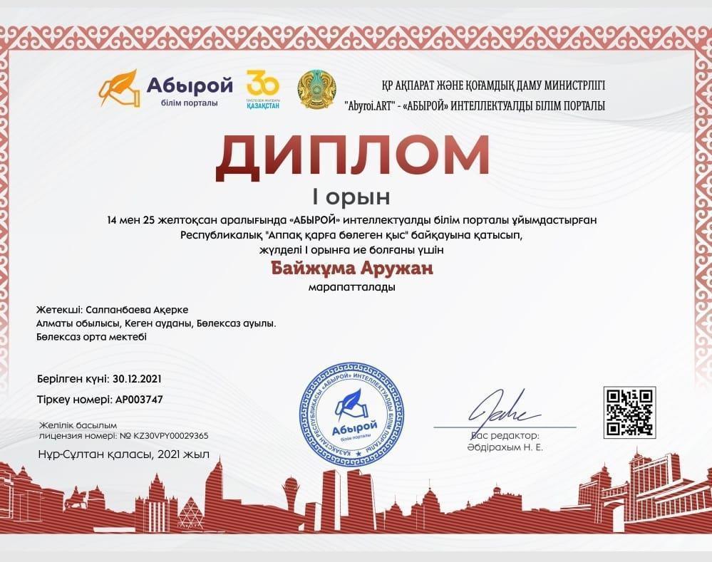 21 декабрь 2021 0 1 2 3 4 5 оқушы жетістігі Республикалық "Аппақ қарға бөлеген қыс" байқауына қатысып,эсседен I орын алған Байжұма Аружан марапатталды. Жетекшісі Салпанбаева Ақерке
