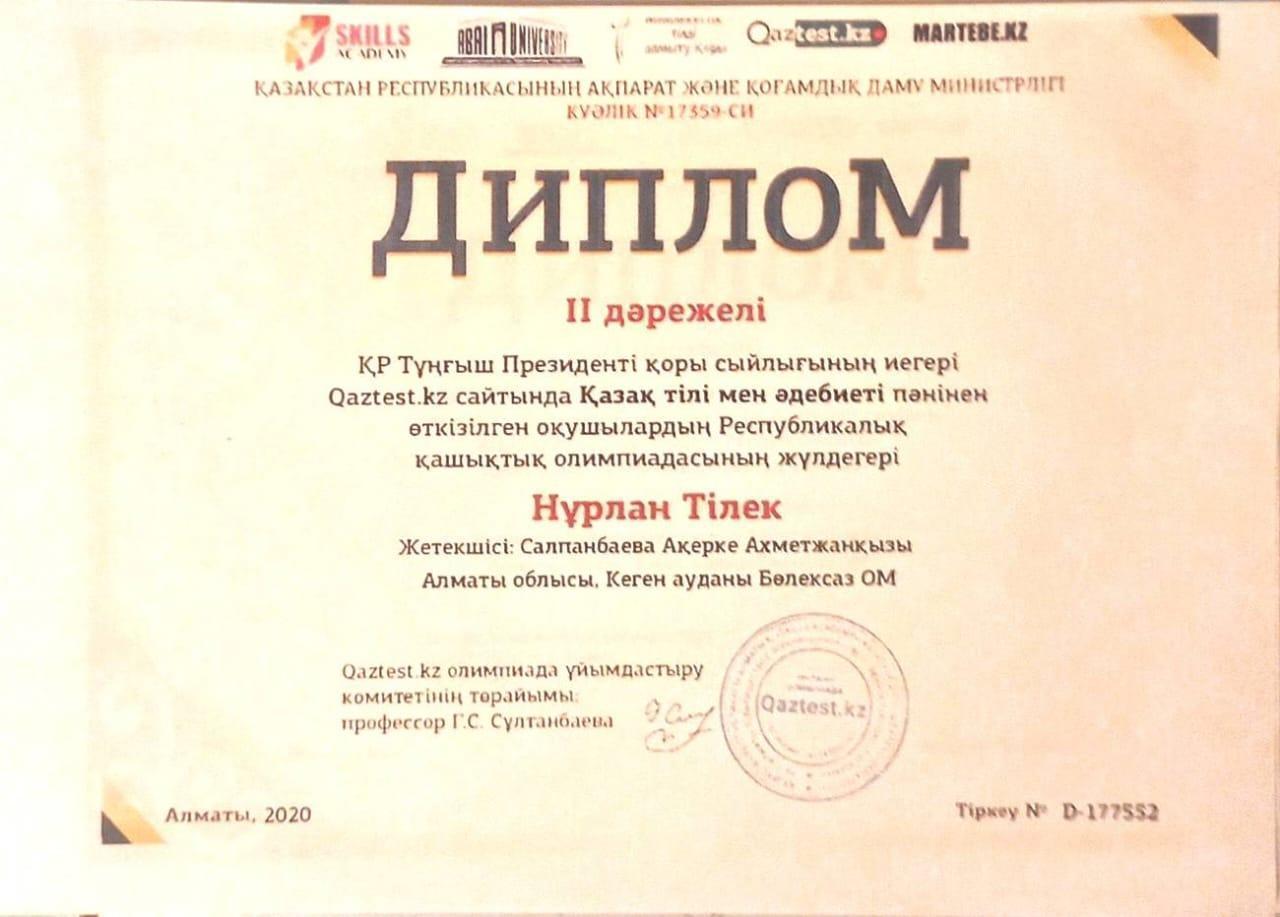 15 октябрь 2020 0 1 2 3 4 5 оқушы жетістігі Қазақ тілі мен әдебиеті пәнінен Республикалық қашықтық олимпиадасында II дәрежелі дипломмен 5-сынып оқушысы Нұрлан Тілек марапатталды. Жетекшісі Салпанбаева Ақерке