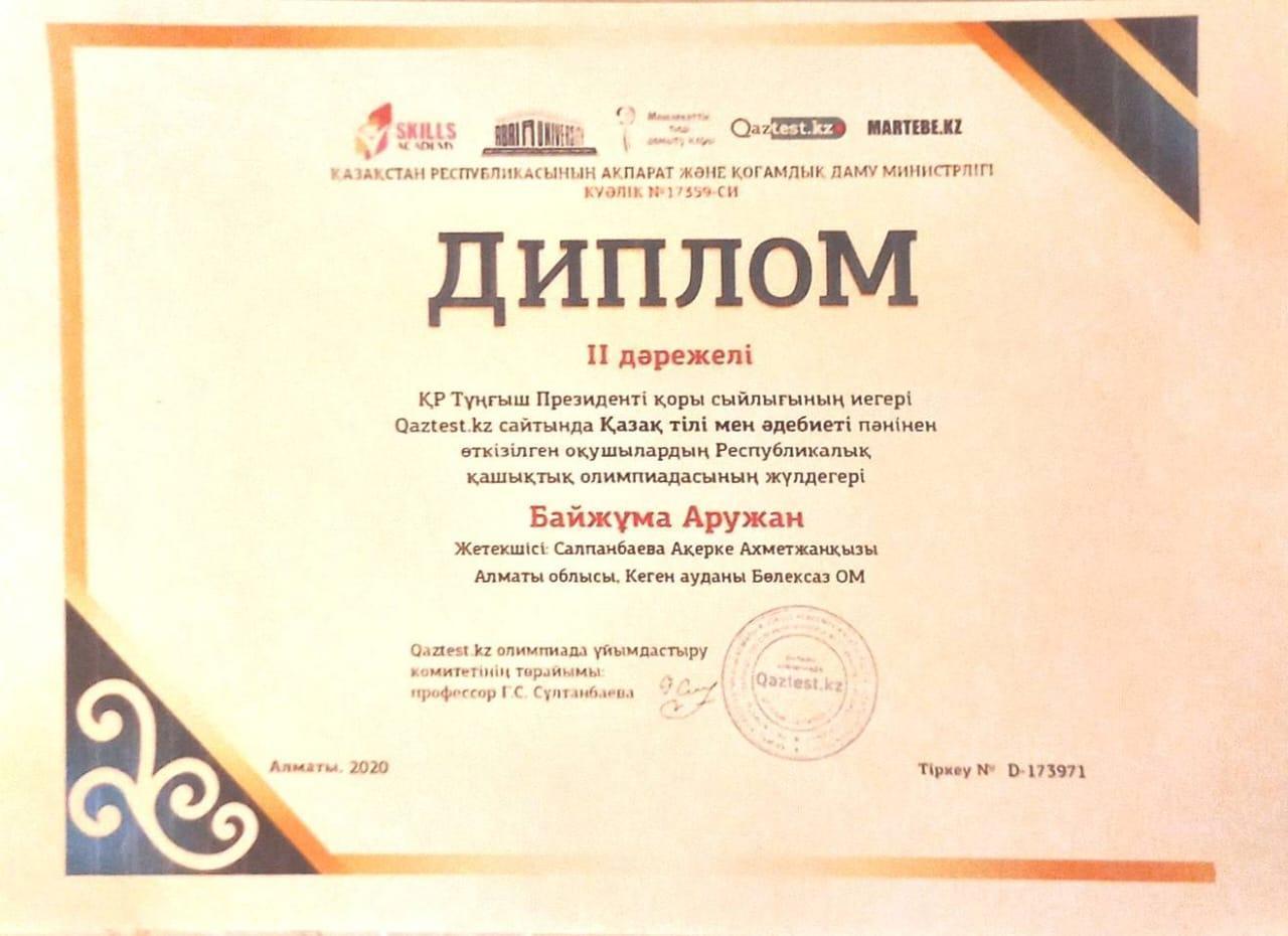 15 октябрь 2020 0 1 2 3 4 5 оқушы жетістігі Қазақ тілі мен әдебиеті пәнінен Республикалық қашықтық олимпиадасынан II дәрежелі дипломмен 5-сынып оқушысы Байжұма Аружан марапатталды. Жетекшісі Салпанбаева Ақерке
