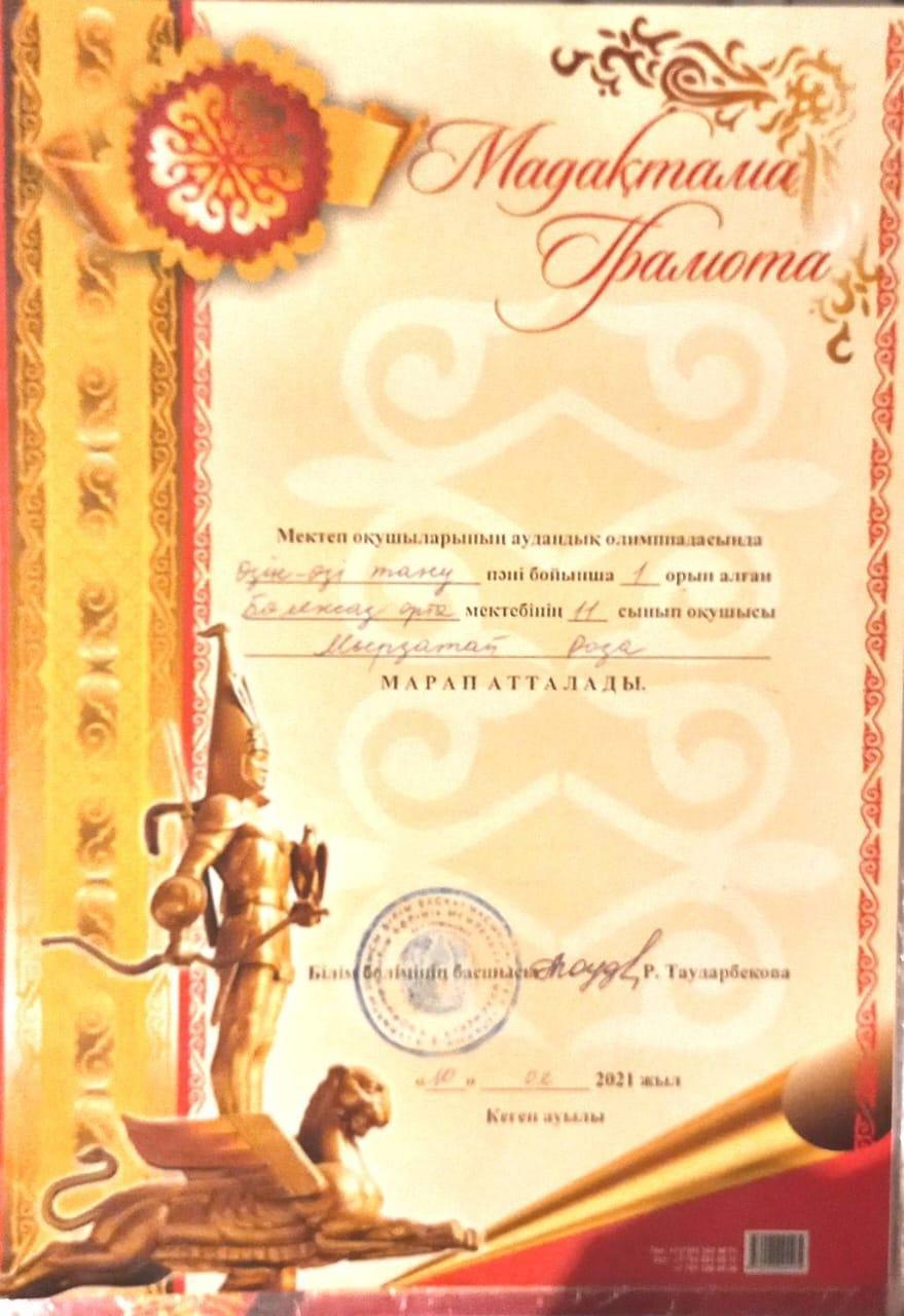 10 февраль 2021 0 1 2 3 4 5 оқушы жетістігі Аудандық пәндік олимпиадада өзін-өзі тану пәні бойынша Мырзатай Роза I орын иеленді. Жетекшісі Салпанбаева Ақерке