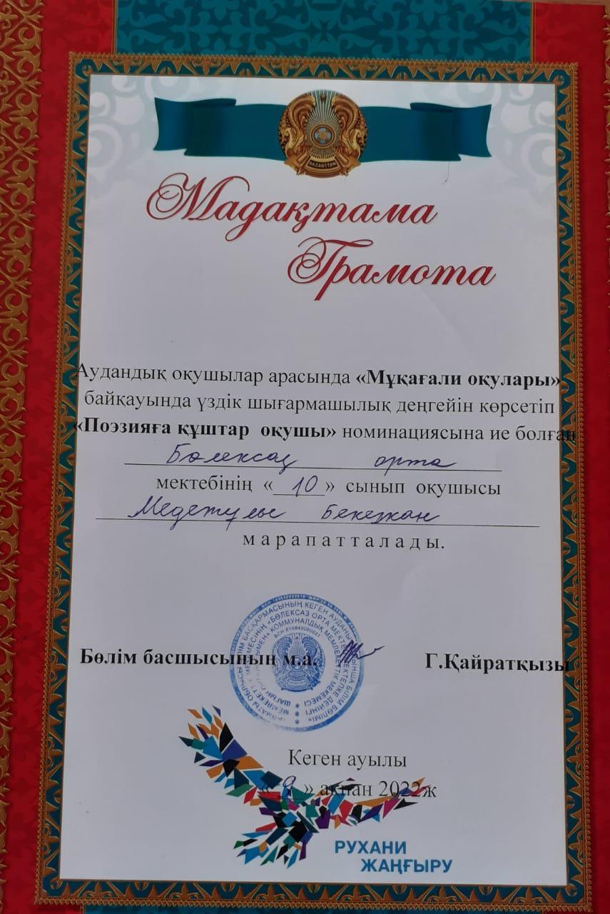 09 февраль 2022 0 1 2 3 4 5 оқушы жетістігі Аудандық оқушылар арасында" Мұқағали оқулары" байқауында "Поэзияға құштар оқушы номинациясын алған 10 сынып оқушысы Медетұлы Бекежан марапатталады.Жетекшісі Жаймбаева Динара