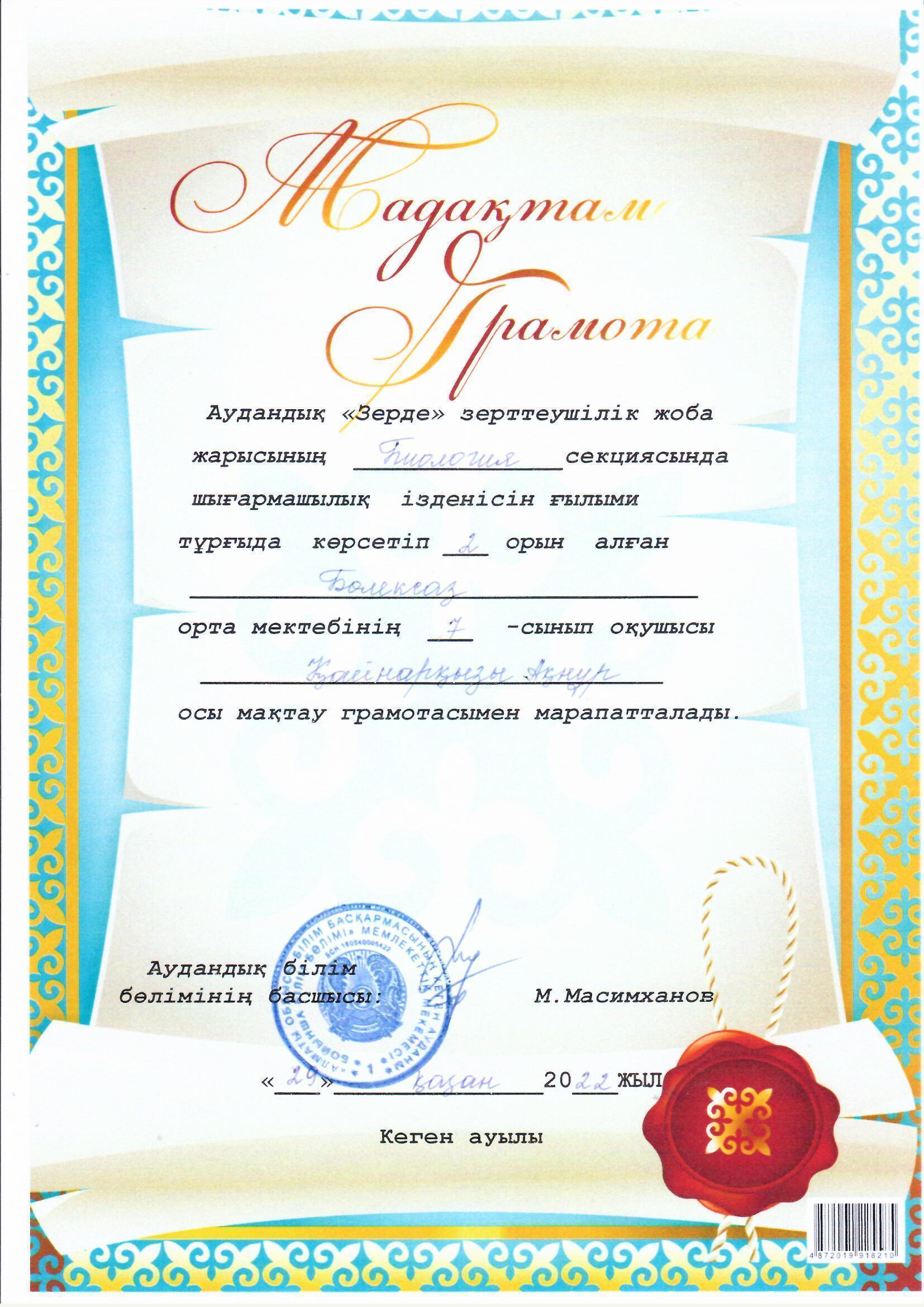 29 октябрь 2022 0 1 2 3 4 5 Аудандық "Зерде" зертеушілік жоба Аудандық "Зерде" зертеушілік жоба жарысында 7 - сынып оқушысы Қайнарқызы Ақнұр 2 орын иеленді. Жетекшісі биология пәні мұғалімі - Болатжанұлы Руслан.